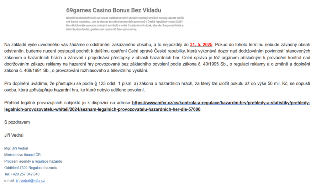 Podle ministerstva přišlo na úřad oznámení s cca 80 weby odkazující na nelegální obsah a nepovolené hry, majitele těchto stránek tedy úředníci obeslali zmíněným mailem.